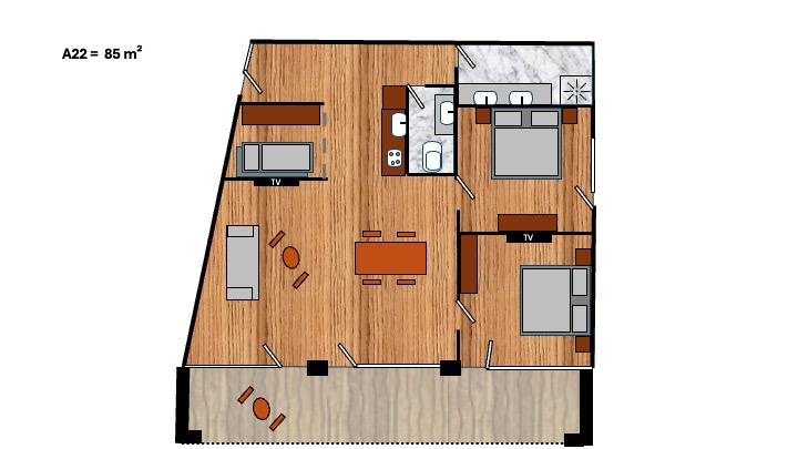 Alle unsere Apartments, ausgenommen Kat. 2L verfügen über einen Balkon oder eine Terrasse mit Sitzgelegenheiten.
